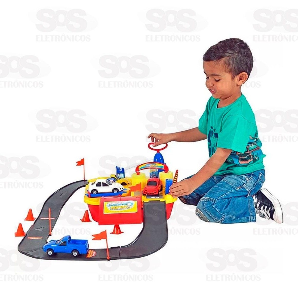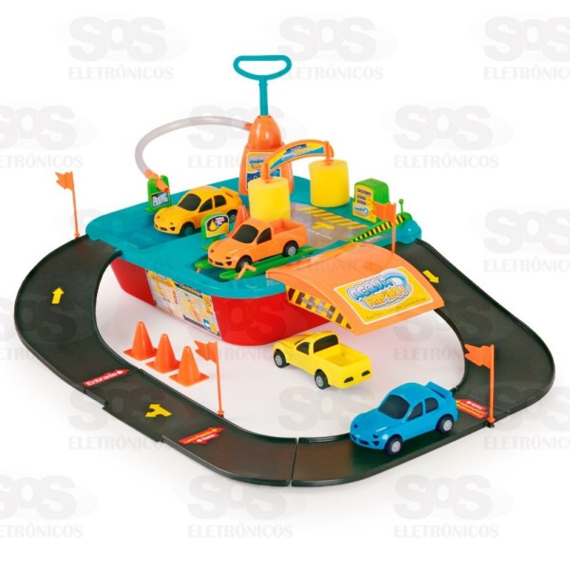Um super brinquedo para meninos, um lava rápido com rampas, bomba de gasolina, troca de óleo, cancela para controlar o trânsito e torre com mangueira de água.