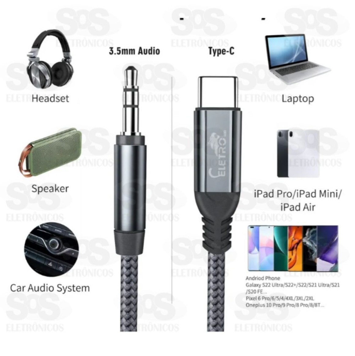 Cabo Auxiliar Type-c Para P2 Conector 3.5mm Eletromex El-3120-TY