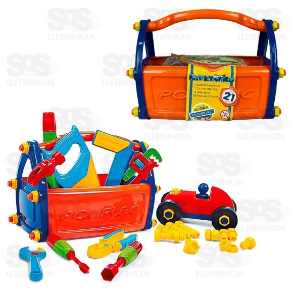 Itens: 1 Martelo, 1 Alicate, 1 Serrote, 1 Esquadro, 1 Chave Grifo, 1 Chave Inglesa, 1 Chave Philips, 1 Chave de Fenda, 1 Chave Canhão, 10 Parafusos plásticos c/ porcas, 1 Carrinho e 1 Caixa de Ferramentas.
