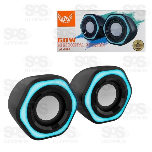 Caixa de Som Multimídia 60W Altomex AL-1076 Caixa de som para computador ou outros dispositivos com saída P2. Design inovador que reproduz sons com mais nitidez. Com iluminação LED. - Tamanho dos alto-falantes: 52mm - Tamanho do cabo: 1,2 metros