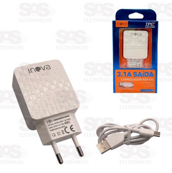 Carregador 2 USB 3.1A Com Cabo Type C Inova CAR-5256C