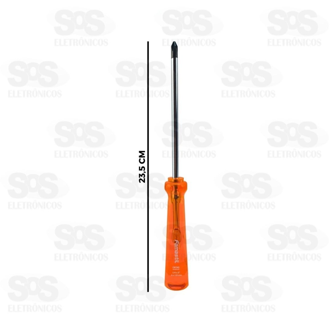 Chave philips em cromo vanádio e cabo reforçado em PVC transparente.