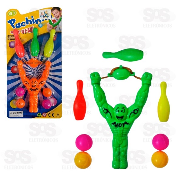 Estilingue com 4 bolas e 3 pinos para treinar a mira e derrubar os alvos.