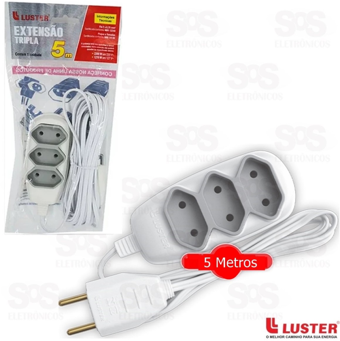 Extensão elétrica 3 tomadasCabo PP bitola 0,75 300v com 5 metrosTomada 2 pinos Capacidade Máxima 10ACom selo do Inmetro