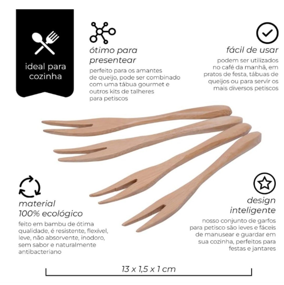 são feitos de bambu 100% ecológico. São leves, fáceis de manusear e fáceis de guardar em sua cozinha. Perfeitos para servir petiscos em festas e jantares. Medidas: C-13cm L-1,5cm A-1cm e Pesa: 23 gramas