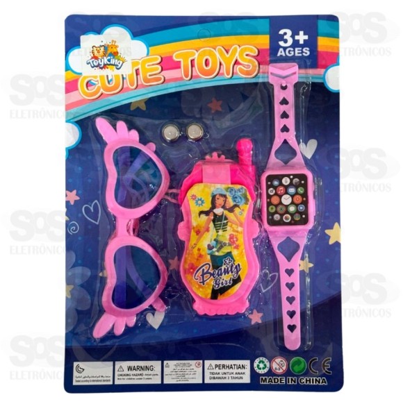 Acompanha 1 celular musical à pilha, 1 relógio de brinquedo e 1 óculos muito estiloso.