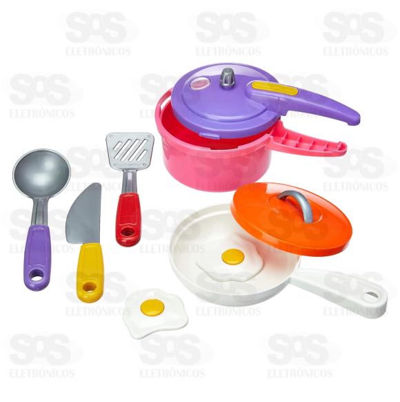 Acompanha 1 panela de pressão, 1 frigideira com tampa, 3 talheres e 2 ovos.