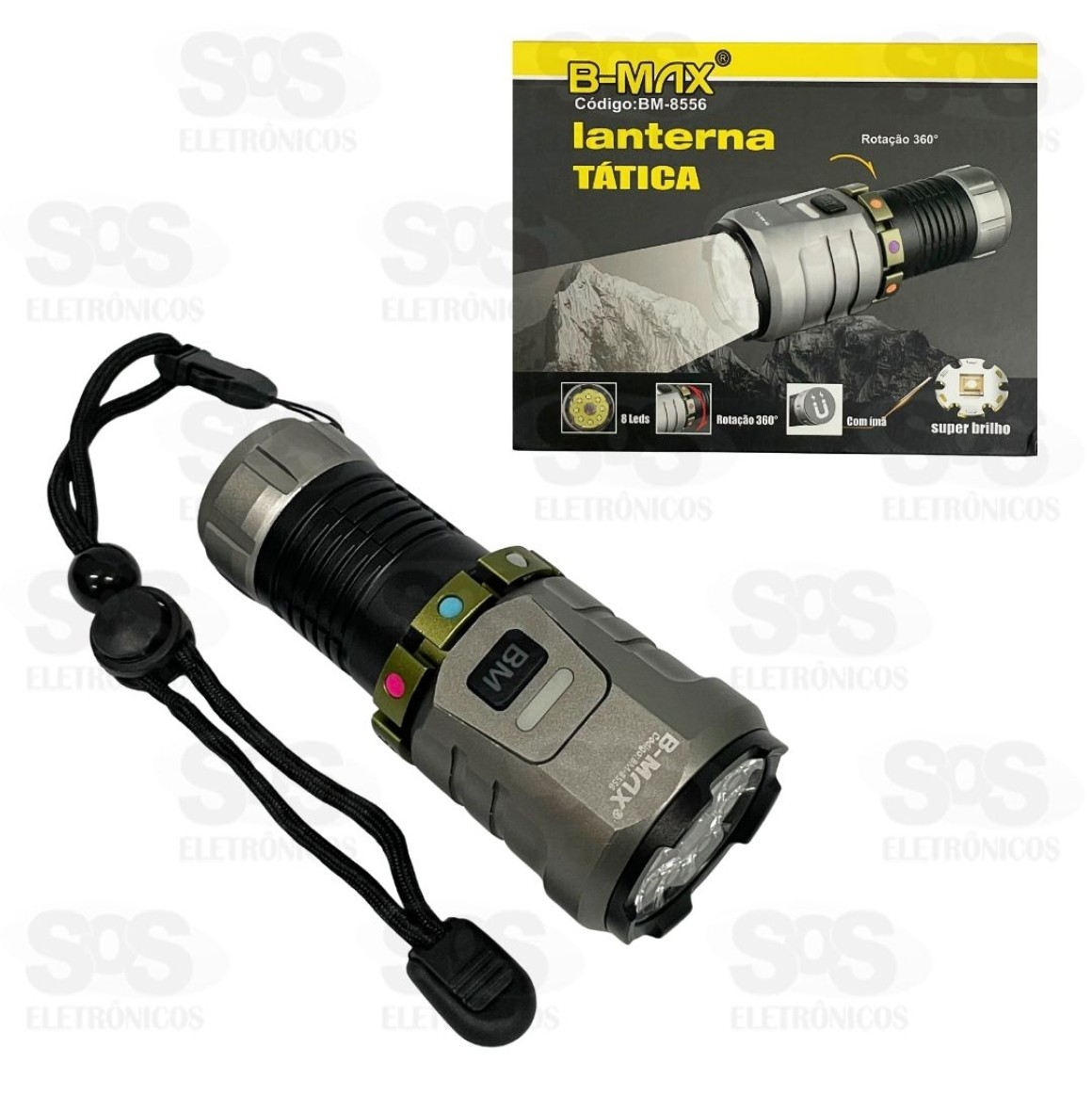 Lanterna Tática LED Recarregável B-Max BM-8556 Esta é uma ferramenta de muita importância para atividades como montanhismo, trilhas, caças, pescas, escaladas, acampamentos, patrulhas de policiais e bombeiros, ou apenas para ter no seu carro como forma de precaução. Feita em liga de alumínio, ela é resistente ao desgaste, resistente à água e antiderrapante. Oferece iluminação intensa e clara, proporcionando uma visibilidade de até 1.000 metros. Modo de luz: Super forte, forte, média, fraca, pisca e luz vermelha Bateria recarregável de alta capacidade. Potência: 30W Tamanho: 10,5 x 4,5 cm Cor: Preto e cinza