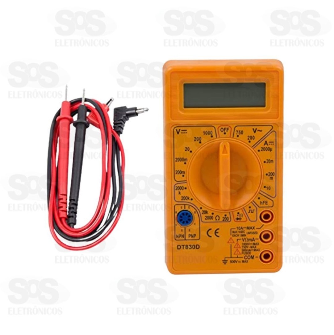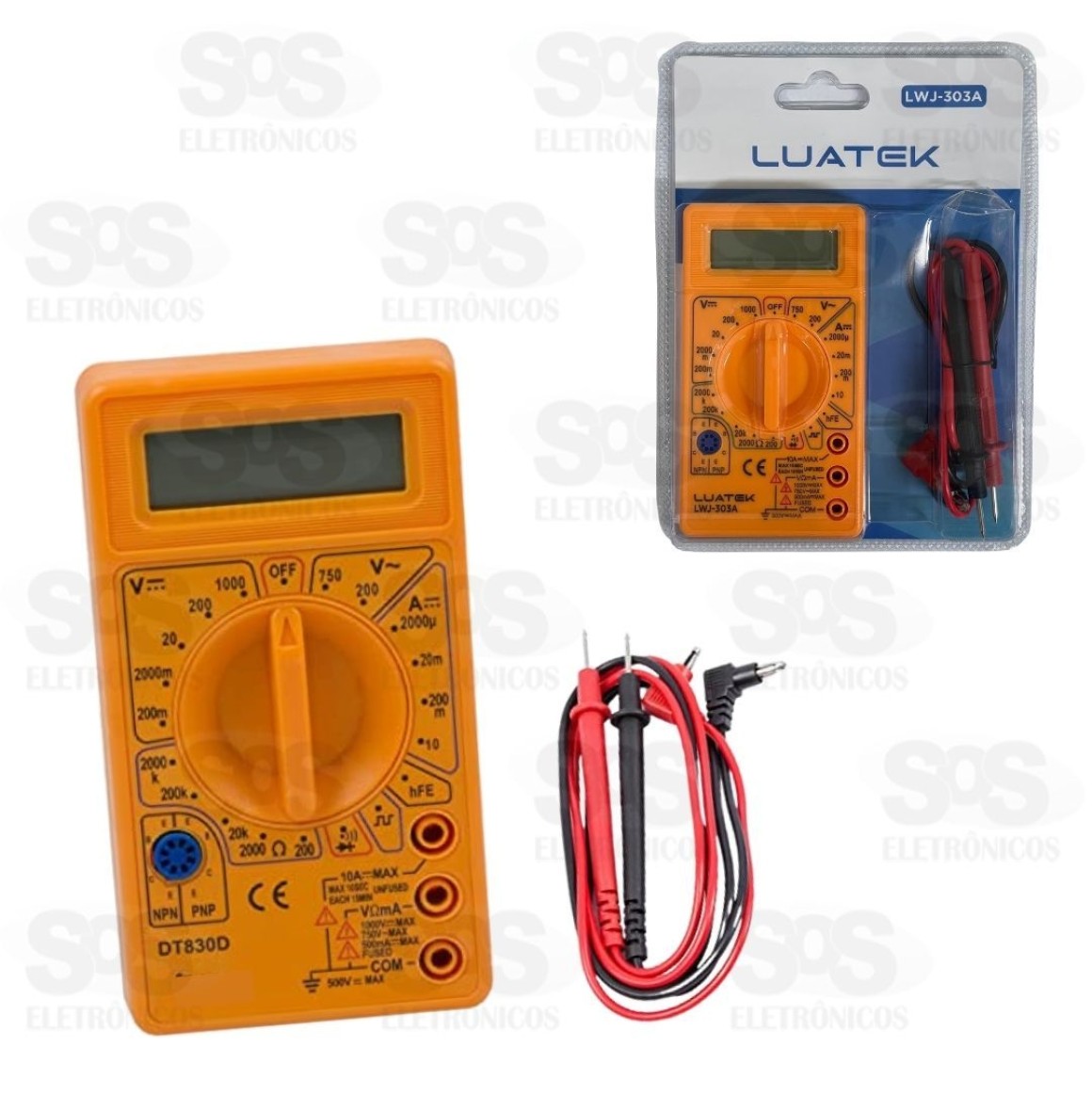 Multímetro Digital Com Cabo Luatek LWJ-303A Ferramenta ideal para eletricistas e técnicos de eletrônica. Ele mede a tensão contínua, tensão alternada, corrente contínua, teste de diodos, teste de transistores e resistência. - Display digital - Indicação de sobre-faixa: Mostra apenas o dígito mais significativo - Temperatura de operação: 0°C a 50°C, RH <70% - Temperatura de armazenamento: -20°C a 60°C, RH <80% - Tamanho: 12 x 7 cm - Cor: Laranja
