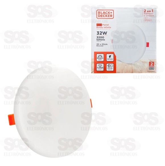 Painel Redondo Borda Infinita 2 em 1 LED Branco 32W Black+ Decker Painel redondo excelente para diversas aplicações, com seu sistema 2 em 1 que permite a instalação de embutir ou sobrepor. Oferece uma iluminação limpa, com foco fixo e direto, proporcionando maior eficiência para quem precisa de estilo, requinte e excelente iluminação. Até 80% mais econômico do que as lâmpadas comuns. Super fácil de ser instalado, pode ser colocado sobreposto em lajes ou embutidos em forros. - Potência: 32W - Temperatura de cor: 6500K - Fluxo: 3200Im - Material:Plástico e ferro - Cor: Branco frio - Ângulo de luz: 120° - Voltagem: 100V - 240V (Bivolt) - Vida útil: 15.000 horas - Tamanho: 22 cm