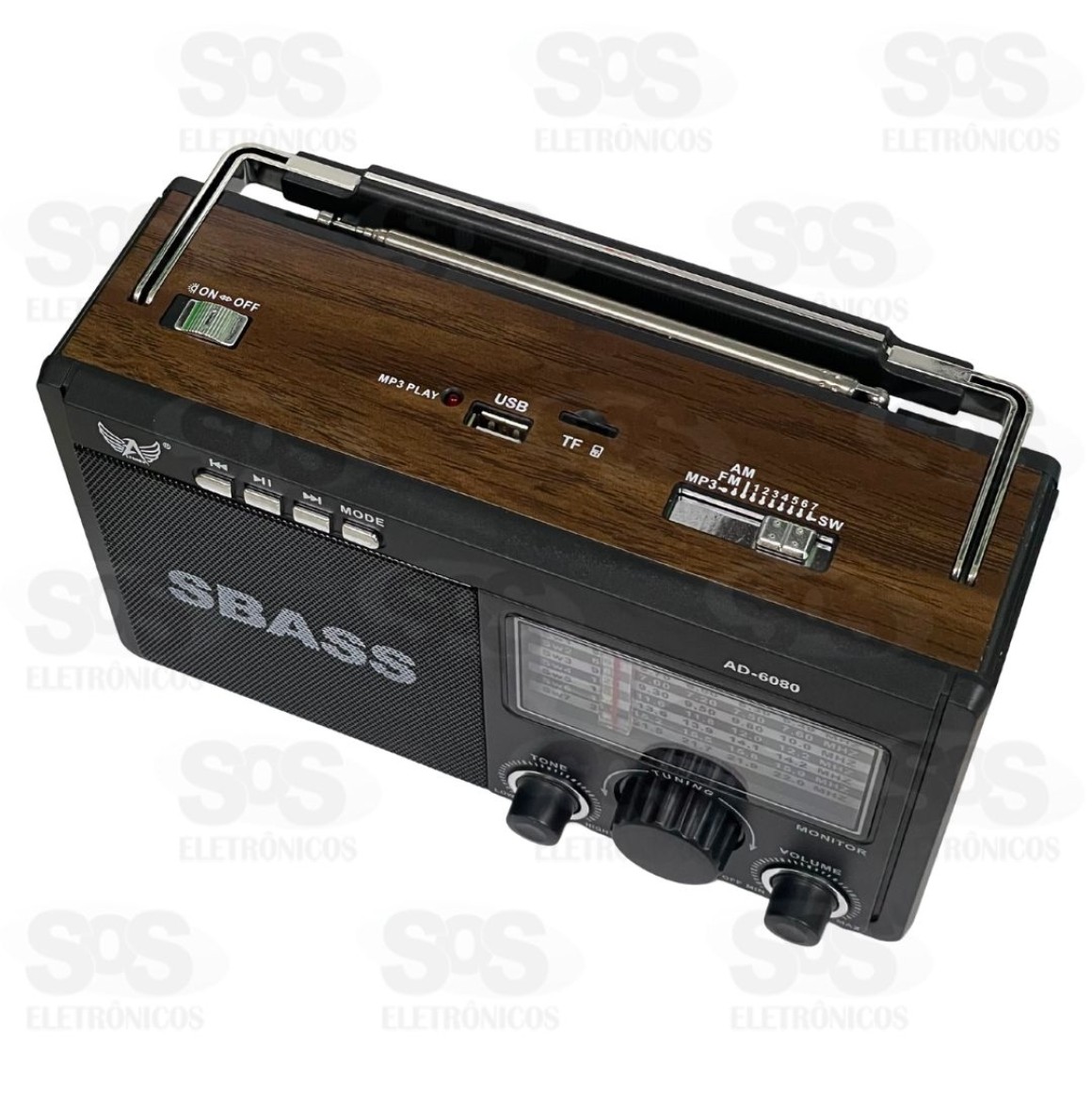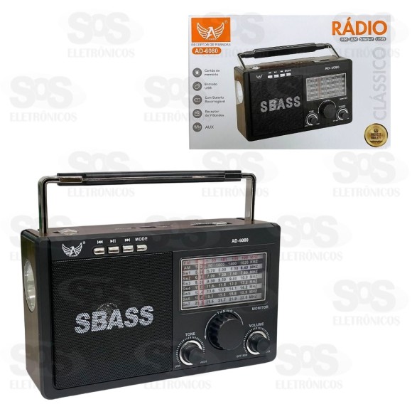 Rádio Retrô 9 Bandas Com Lanterna Altomex AD-6080 Rádio receptor de 9 bandas, possibilitando a sintonização FM, AM e SW 1-7. Conta também com conexão bluetooth, além de entradas para USB, AUX e cartão TF. Bateria recarregável via cabo Type-C. Acompanha alça para transporte e lanterna. Tamanho: 22 x 13 cm Cores variadas.