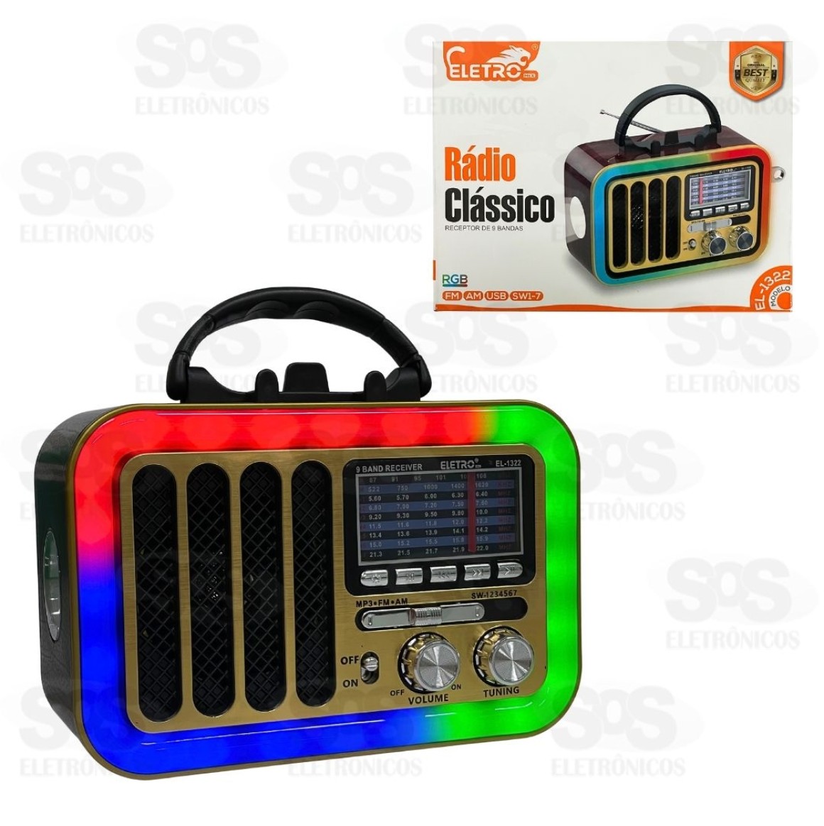 Rádio Retrô Bluetooth/FM/AM 9 Bandas Eletromex EL-1322 Rádio receptor de 9 bandas, possibilitando a sintonização FM, AM e SW 1-7. Conta também com conexão bluetooth, além de entradas para USB e cartão TF. Bateria recarregável via cabo Type-C. Acompanha alça para transporte e lanterna. Tamanho: 20,5 x 13,5 cm Cores variadas