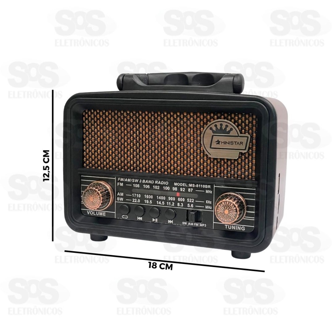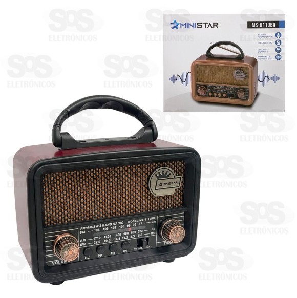 Rádio Retrô Portátil 5W Bluetooth Ministar MS-8110BR - Conexão bluetooth e receptor de 3 bandas. - Entrada USB e Cartão TF - Potência: 5W - Bateria de 1200mAh recarregável - Alto-falante de 2.25 polegadas - Com alça para transporte - Tamanho: 18 x 12,5 cm - Cores variadas