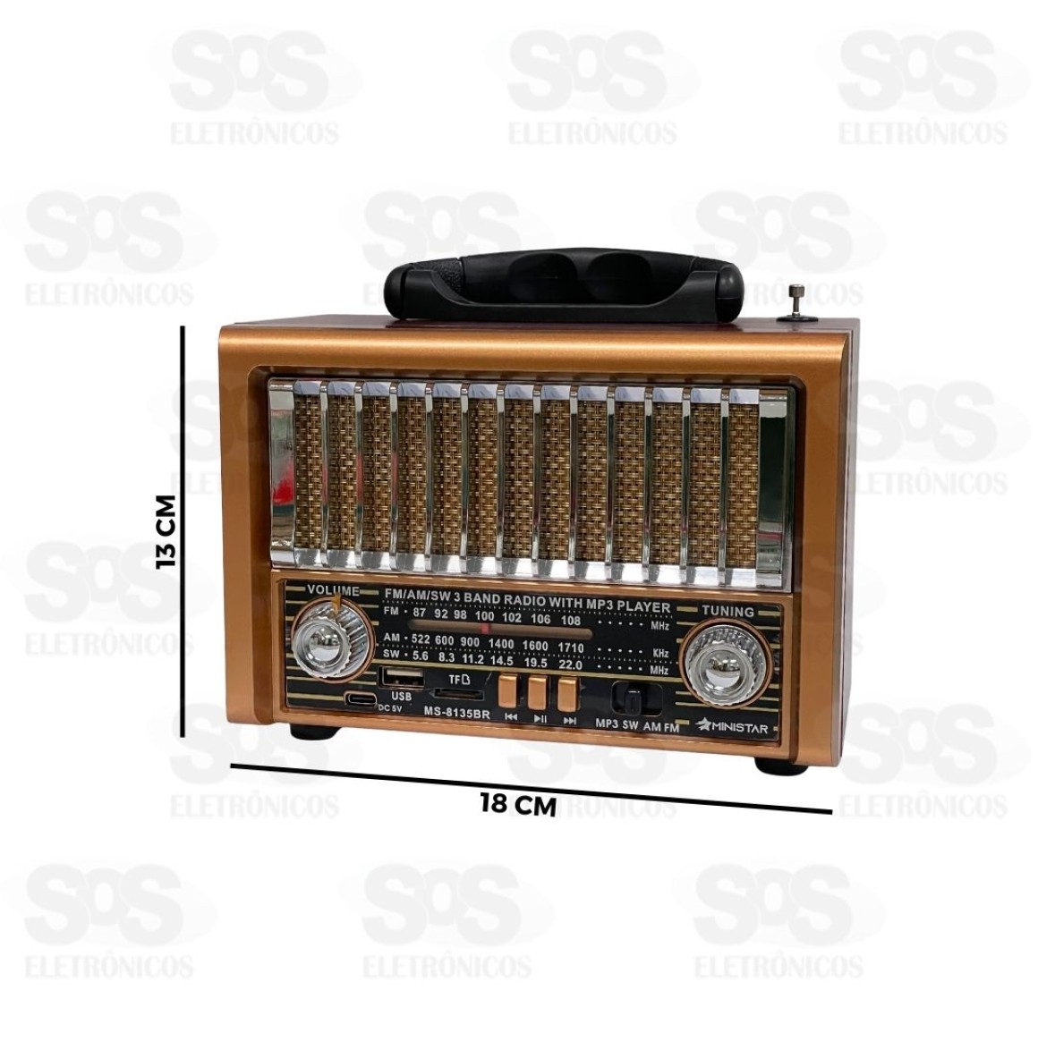 Rádio Retrô Portátil 5W Bluetooth Ministar MS-8135BR - Conexão bluetooth e receptor de 3 bandas. - Entrada USB e Cartão TF - Potência: 5W - Bateria de 1200mAh recarregável - Alto-falante de 2.25 polegadas - Com alça para transporte - Tamanho: 18 x 13 cm - Cores variadas