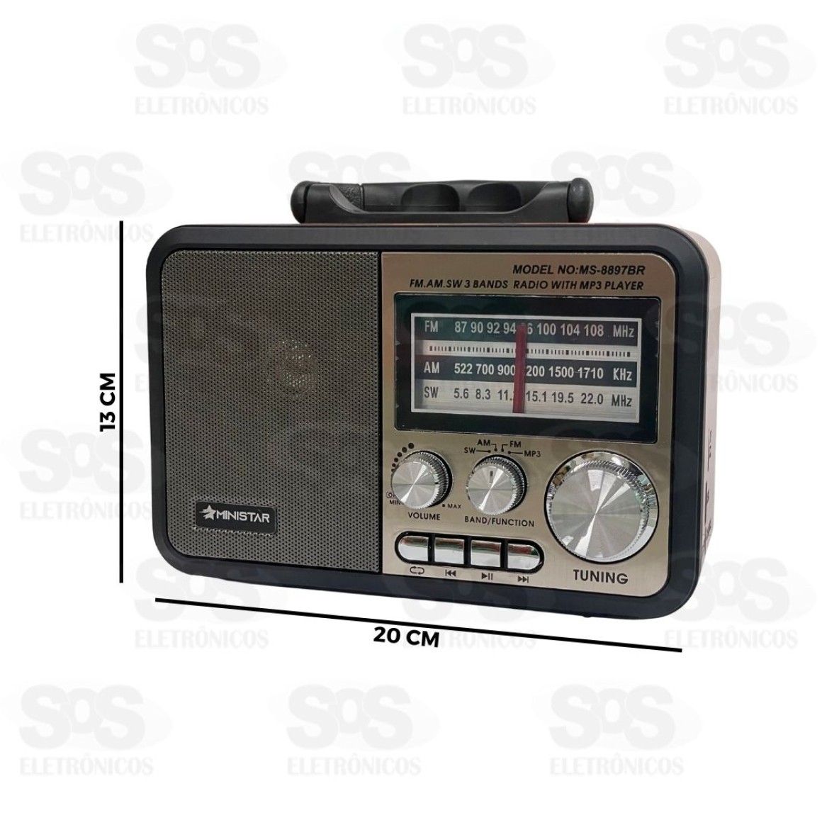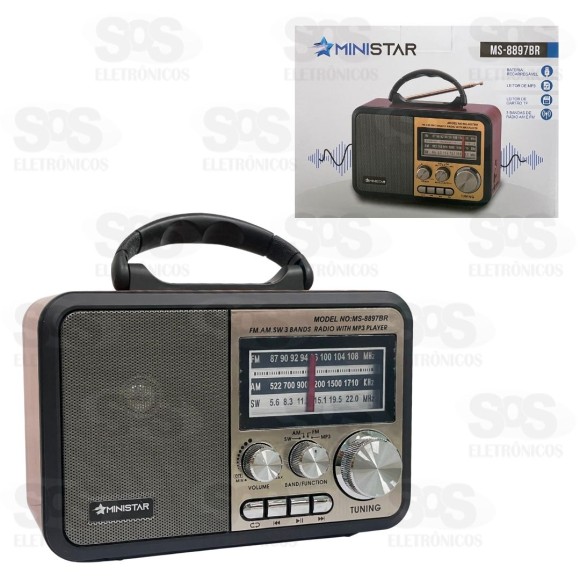 Rádio Retrô Portátil 5W Bluetooth Ministar MS-8897BR - Conexão bluetooth e receptor de 3 bandas. - Entrada USB e Cartão TF - Potência: 5W - Bateria de 1200mAh recarregável - Alto-falante de 3 polegadas - Com alça para transporte - Tamanho: 20 x 13 cm - Cores variadas