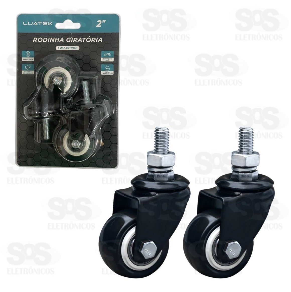 Rodízio Giratório 2 Peças Luatek LWJ-PC1916 Perfeito para móveis e suportes. Resistente, suave e silencioso. Giro de 360 graus. Capacidade de carga: 30Kg Material: Ferro + PVC Diâmetro da roda: 50 mm Largura da roda: 24 mm