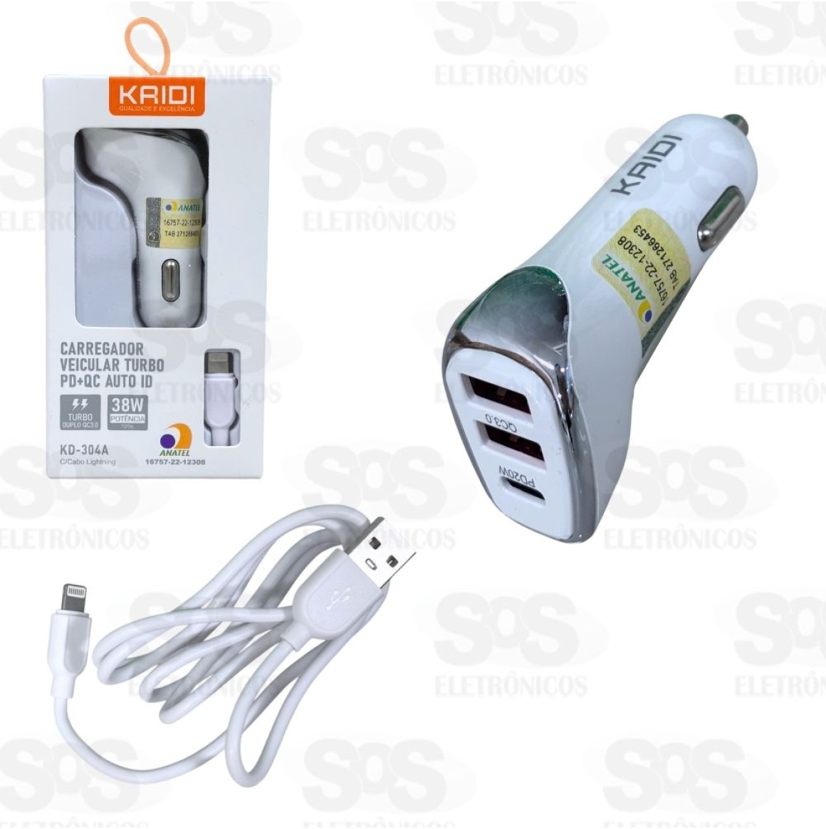 Carregador Veicular Com Cabo Iphone 38W Kaidi KD-304A 2 USB 3.0 + PD Funciona em todos os veículos com entrada 12V/24V (bivolt) no acendedor. Carregamento rápido e seguro. Acompanha cabo iphone Potência máxima: 38W Cores Variadas