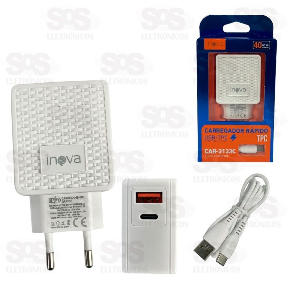 Carregador USB 3.0 + PD 40W Com Cabo Type C Inova CAR-3133C