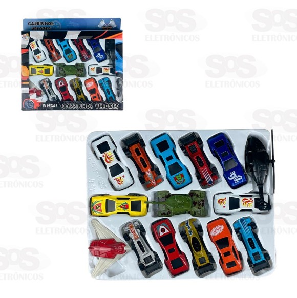 Acompanha 15 carrinhos velozes de cores e modelos sortidos.