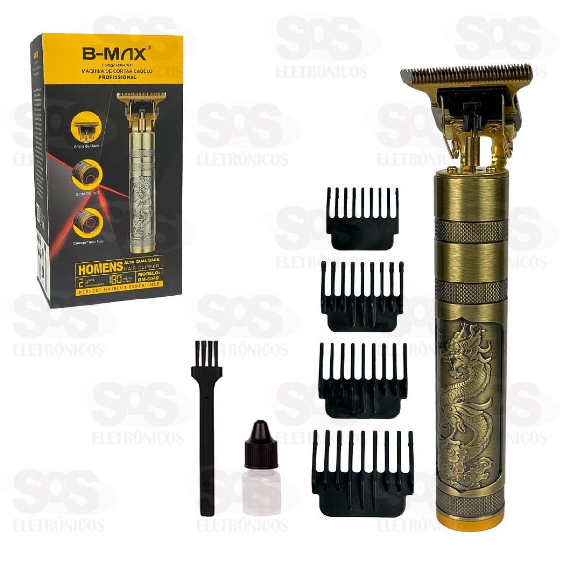 Máquina Para Acabamentos Recarregável Dragão B-Max BM-C040 Máquina ideal para acabamentos e desenhos em cabelo e barba. Motor de alta potência e durabilidade, em formato de T. Design moderno e elegante com desenho de dragão, muito linda. Lâmina de titânio que não irrita a pele. Bateria recarregável que garante até 180 minutos de uso contínuo. Acompanha 4 pentes de limite, sendo eles de 4mm, 3mm, 2mm e 1,5mm. Com botão liga/desliga. Tamanho: 14,5 x 4 cm
