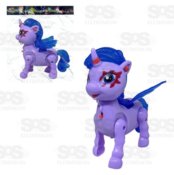 Unicórnio de brinquedo que se movimenta para todos os lados tocando musicas e acendendo luzes.